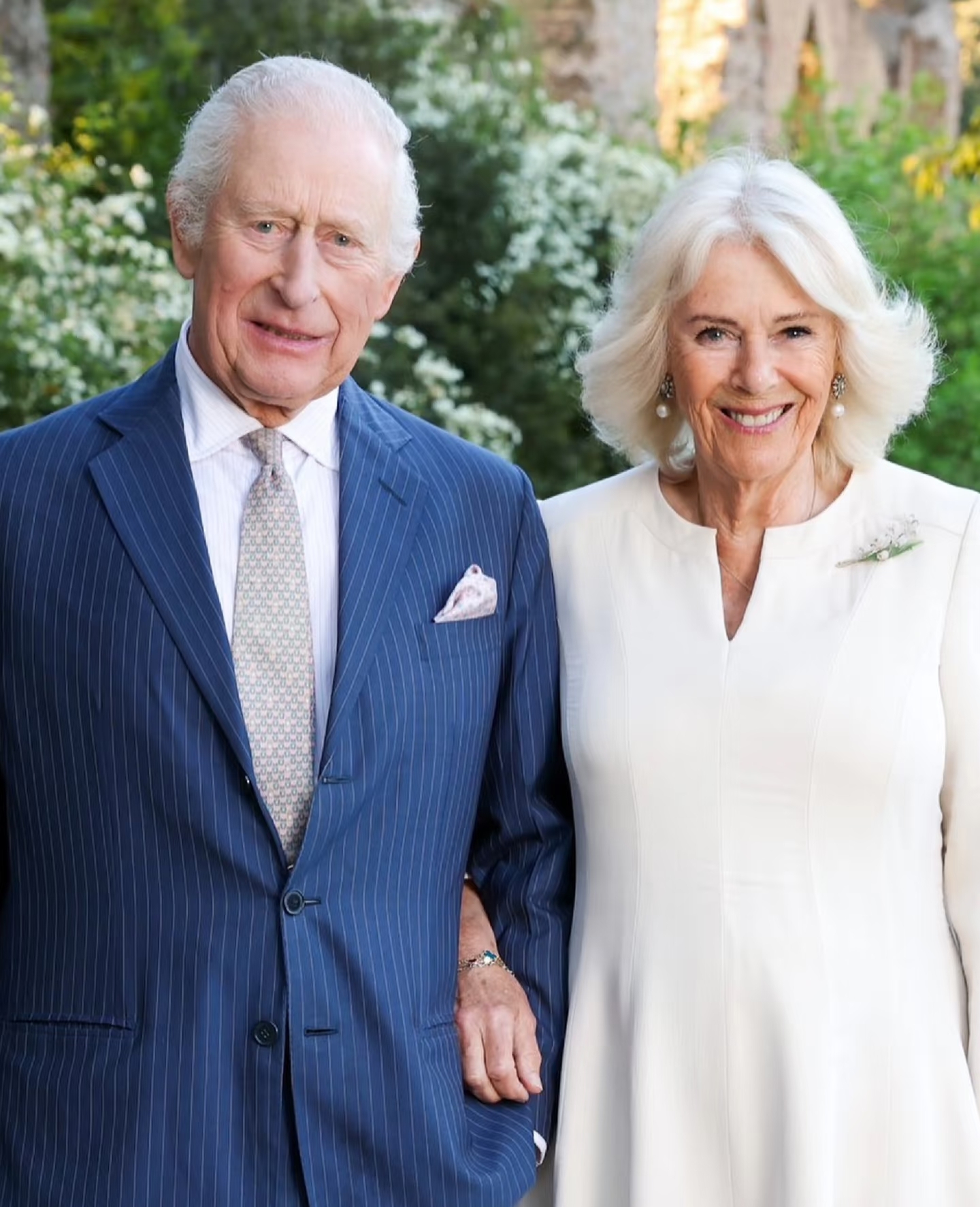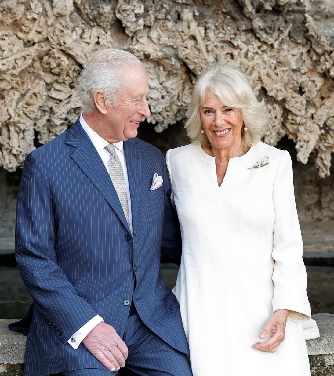照片中,78岁的卡米拉王后身穿白色连衣裙,胸前佩戴着一枚山谷百合花胸针,挽着查尔斯的手,两人面对镜头笑容灿烂。