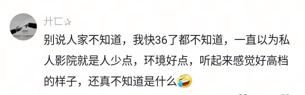 “别说人家不知道,我快36了都不知道,一直以为私人影院就是人少点,环境好点,听起来感觉好高档的样子,还真不知道是什么。”