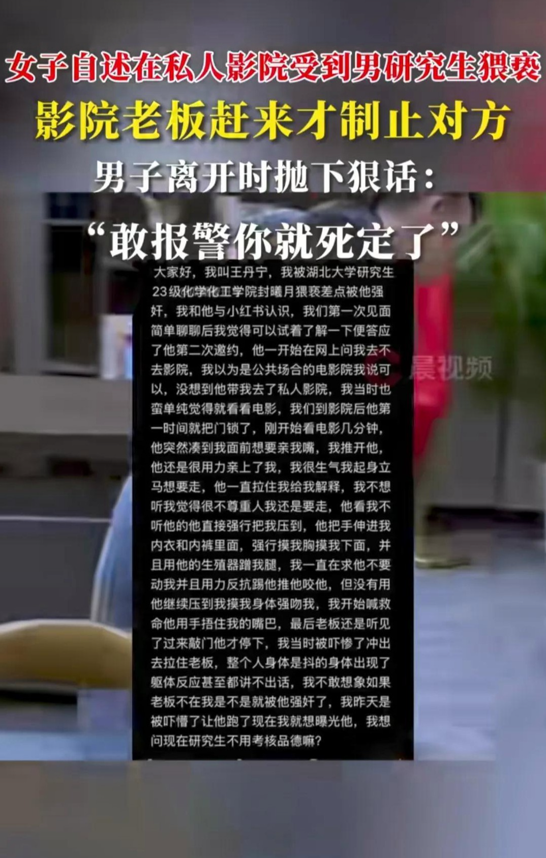 俗话说得好,害人之心不可有,但是防人之心不可无。知人知面不知心,出门在外,女孩子要学会保护好自己,面对不太熟悉和接触不多的异性,还是需要多一个心眼。近日,湖北一大学生王某宁实名曝光了自己被湖北大学研究生封某月在私人影院猥亵一事冲上了热搜,引发了网友们热议。王某宁表示自己和对方第二次见面就遭遇了这种事情,对方在离开时还放狠话威胁自己“敢报警你就死定了了”!事件详情:2月18日,当事人王某宁在某社交平台详细自述了自己遭遇猥亵一事。王某宁自述,对方是湖北大学23级化学化工学院的研究生封某月,二人在社交平台认识,之前曾经见过一面相处还可以,于是就答应了对方的二次邀请。