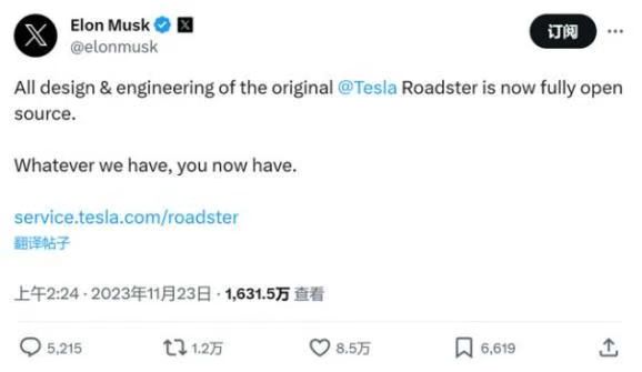 ▲马斯克曾在X上宣布:特斯拉初代跑车Roadster所有的设计和工程已经开源。