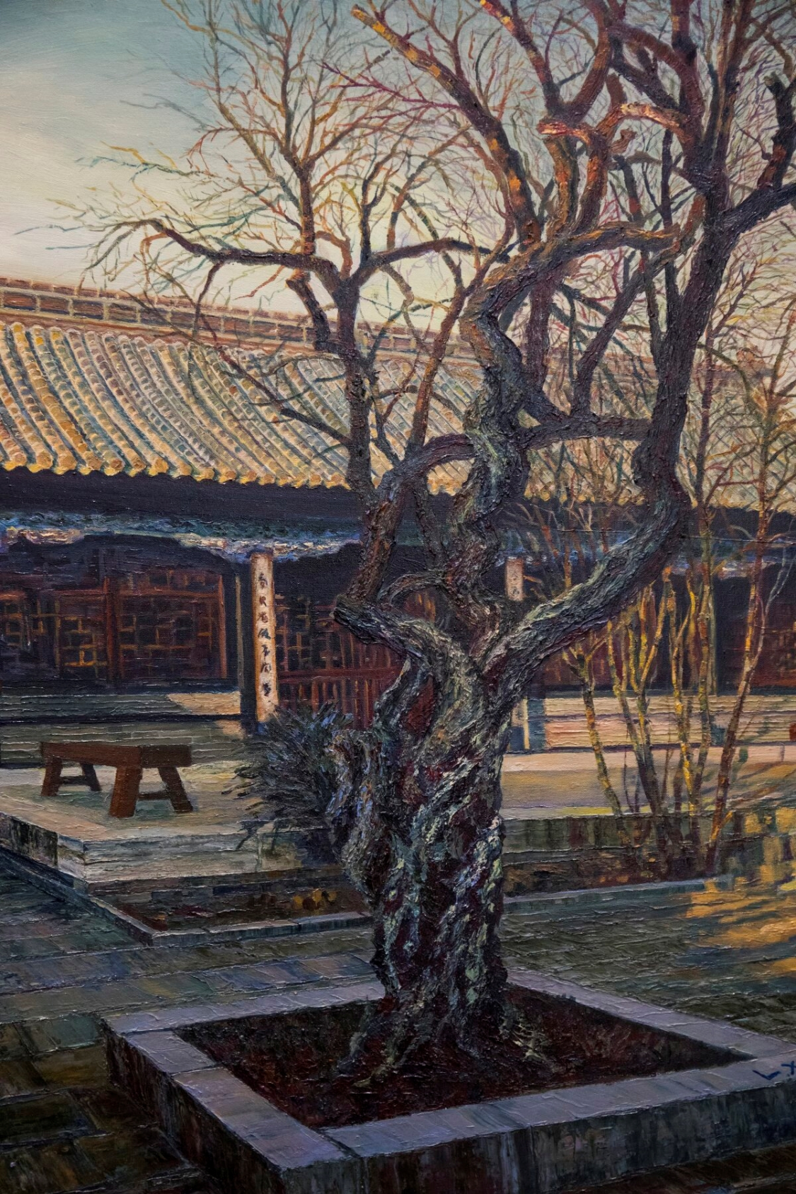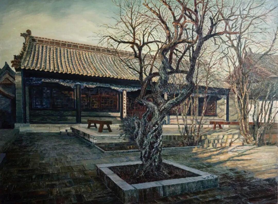 今天我们来看李晓峰先生的两幅油画:《故园之冬》与《泰晤士河风光》。这两幅人文风景油画,通过视觉语言的对比,深刻揭示了画家对东西方文明特质的思索与愿景。东方庭院一作以古树、石坛、灰瓦、回廊构成静谧的时空场域,将“诗意栖居”阐释为与自然韵律共生的精神图景——扭曲的枝干与斑驳的地面并非衰败,而是时间沉淀的禅意;建筑与长凳的空置,暗示着一种留白的、内省式的生存哲学,体现东方美学中“天人合一”的居住理想。