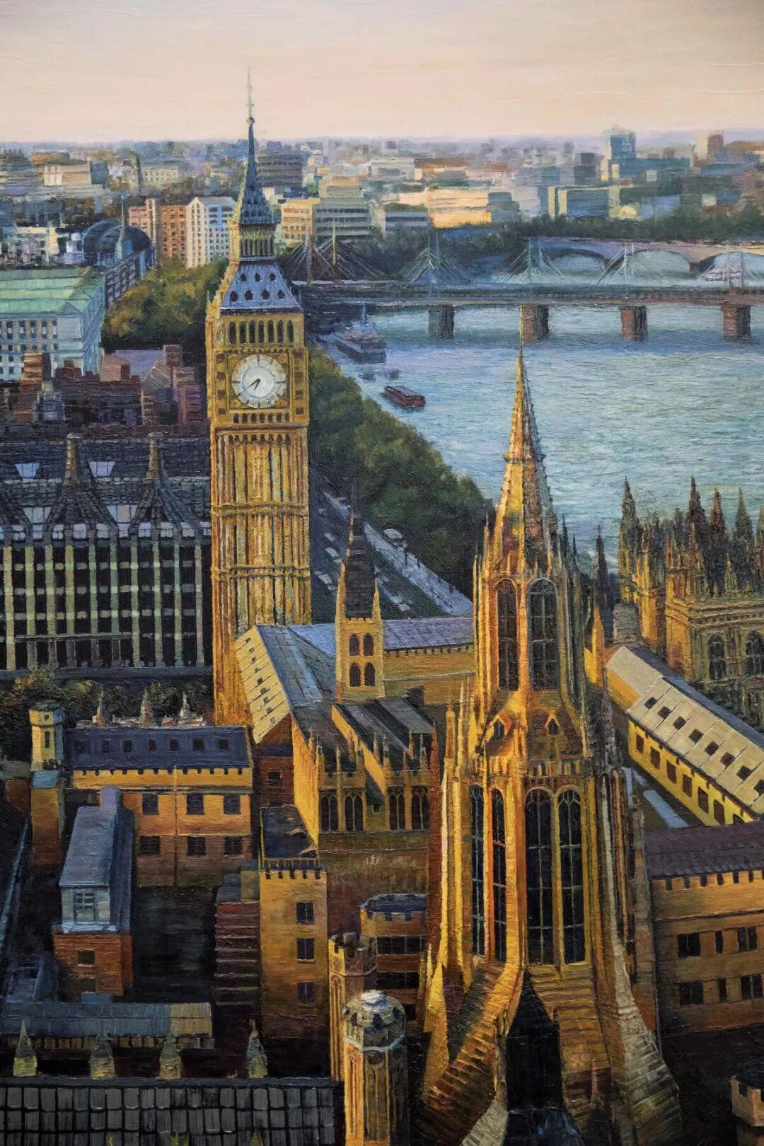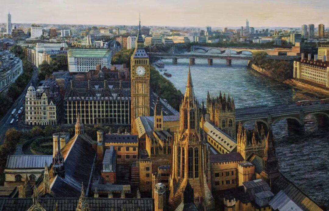 西方城市图景则以大本钟的垂直耸立、泰晤士河的动态流淌、哥特尖顶与现代楼宇的层叠,构建工业文明的纪念碑式叙事。暖黄色调与辉煌的光影,既是对人类技术力量的礼赞,亦暗含对线性进步史观的凝视。桥梁与船舶的繁忙意象,凸显了连接、流动与扩张的现代性逻辑。