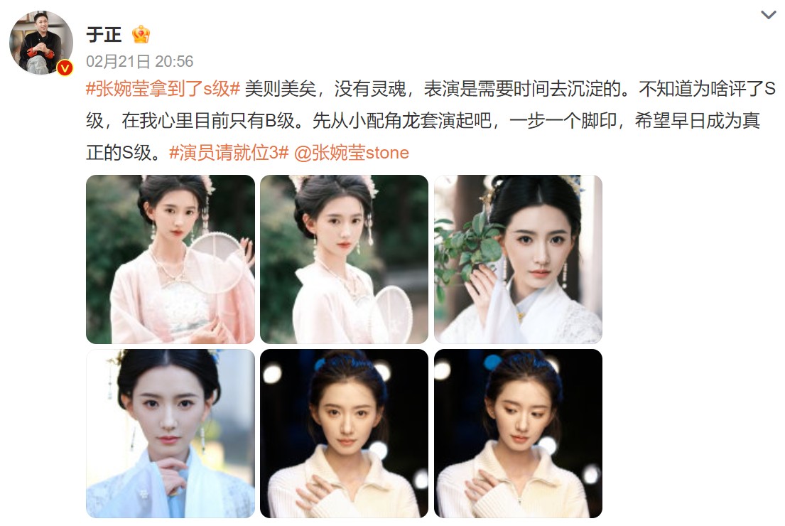 而老板于正也是发博表示,他也不知道为何评了S级,在他心里目前也只有B级。同时也是指出,张婉莹美则美矣,没有灵魂,表演是需要时间去沉淀的。最后也是建议她先从小配角龙套演起,一步一个脚印,希望早日成为真正的S级。