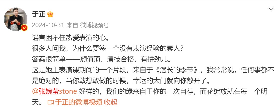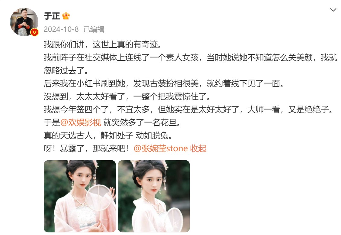一开始于正直接称张婉莹是“奇迹”,直接把他震惊住了,更是破例签约了她。
