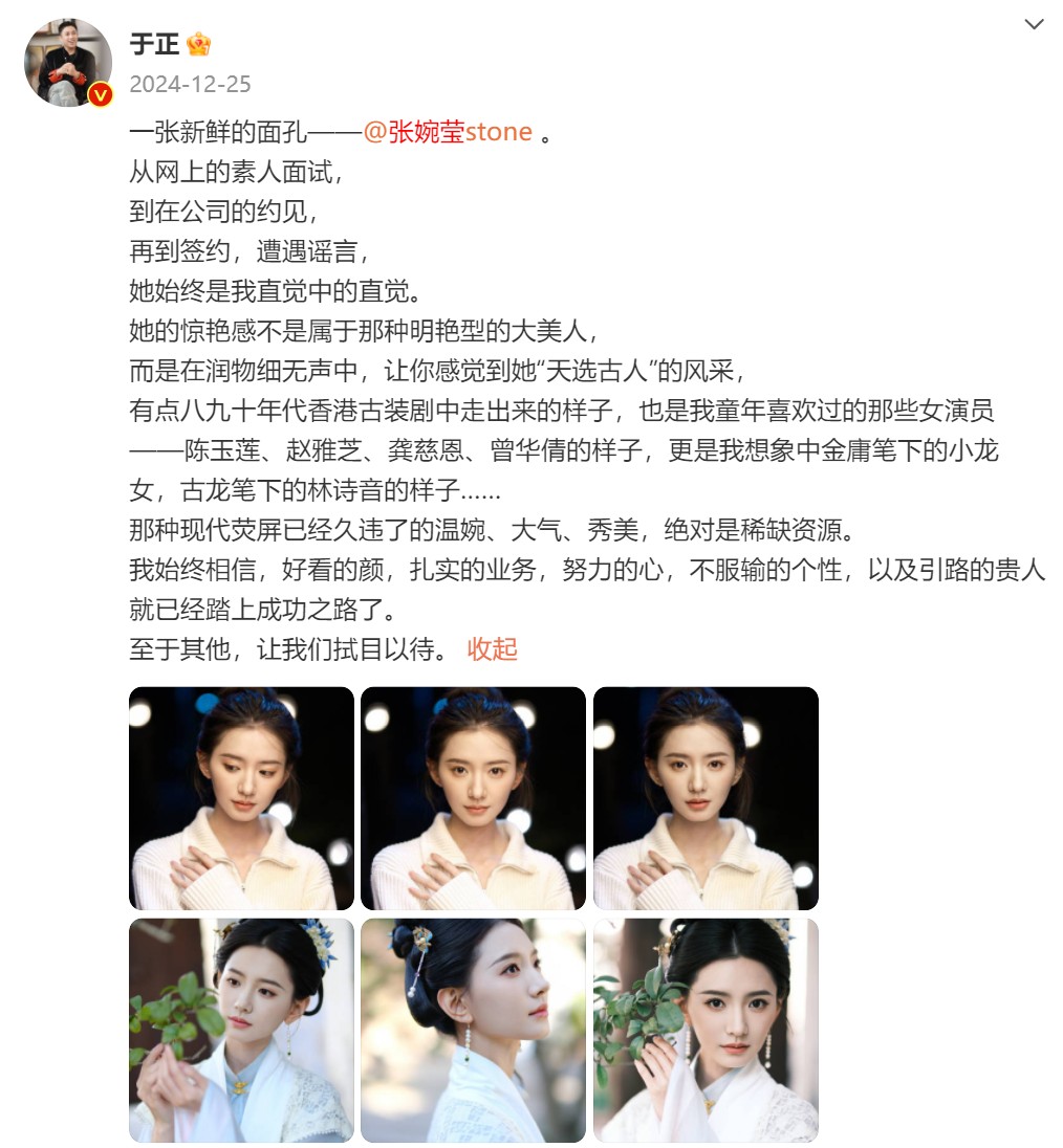 他甚至发文称张婉莹有点八九十年代香港古装剧中走出来的样子,更是拿她和陈玉莲、赵雅芝等人对比。同时也指出,她是现代荧屏已经久违了的温婉、大气、秀美,绝对是稀缺资源。