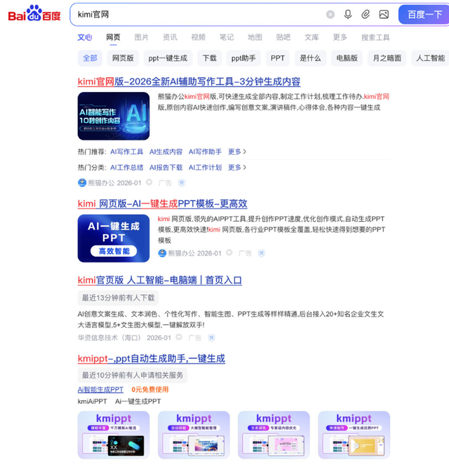 可以看到搜索Kimi时的页面,前四个其实都是标注了广告的字眼。