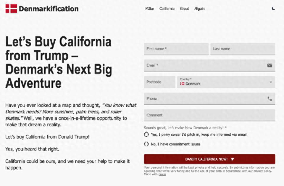网页称,丹麦将向美国开出1万亿美元的报价,加州被丹麦“购买”后,此地将更名为“新丹麦”,当地民众可获得法治、免费医疗和靠谱的政治决策。