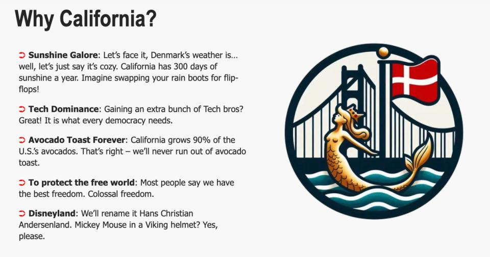 该网站以戏谑的口吻“论证”了丹麦购买加州的原因,包括充足的阳光、在科技上的统治力、盛产牛油果等。网站还戏称,可以将加州的迪士尼乐园改名为“安徒生乐园”,给米老鼠戴上维京头盔。