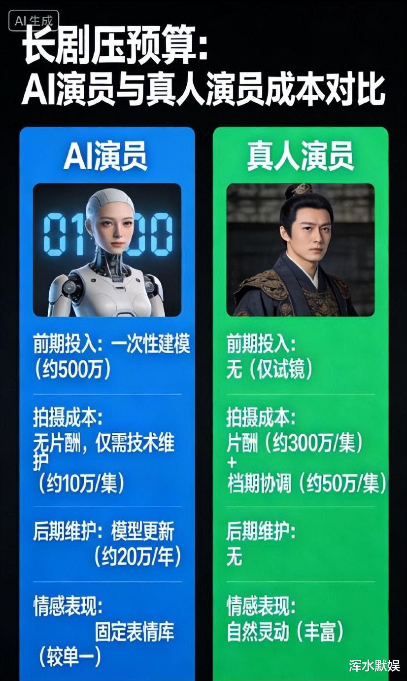 一个普通真人演员一天的片酬,够AI生成上百条表演素材;真人拍摄要等灯光、调情绪,AI演员24小时连轴转不带累的。