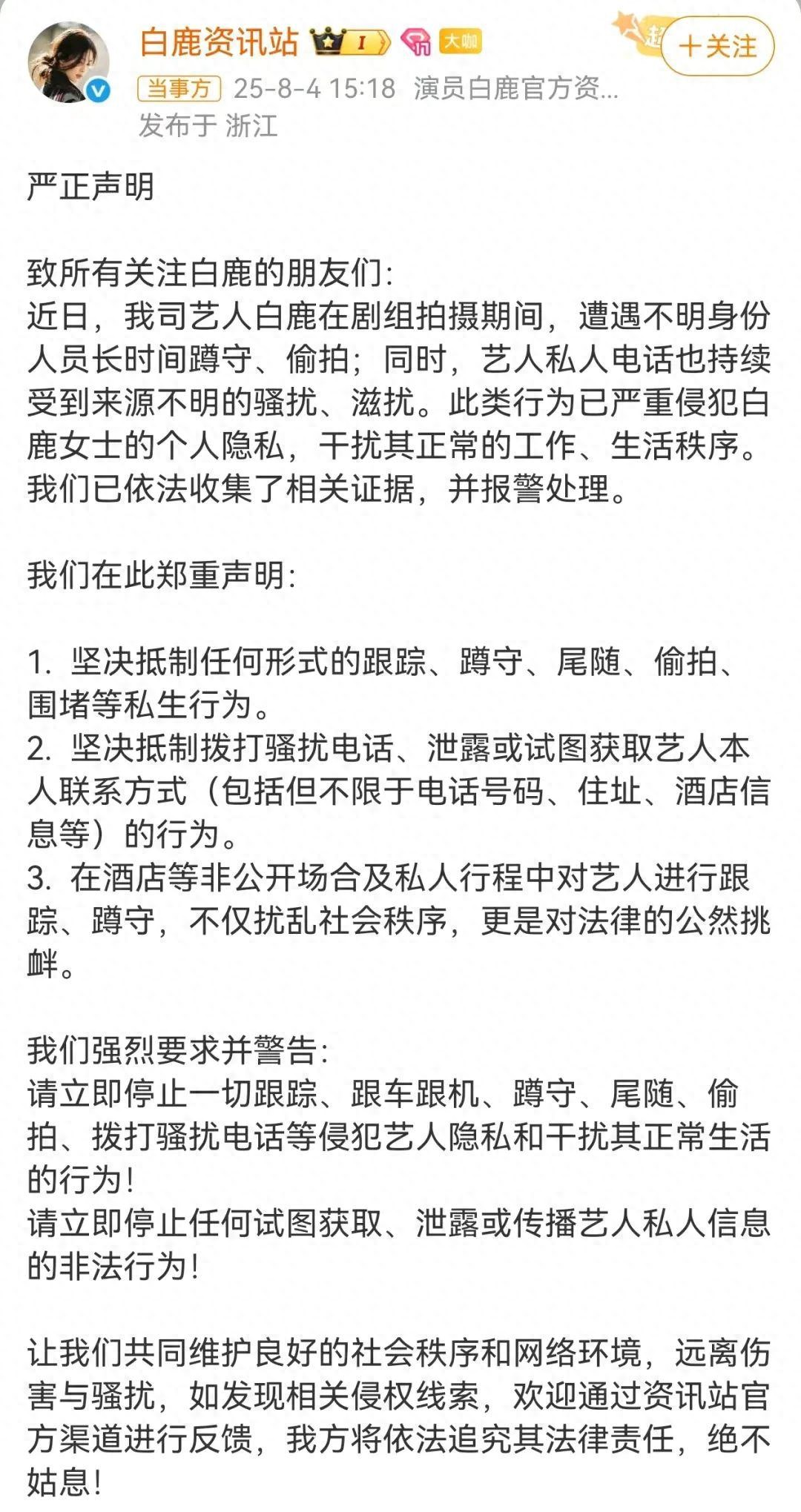 愿白鹿能少被这些糟心事打扰,好好休息、安心搞事业,继续拍出更多好看的作品,也愿她的团队能加强安保,好好保护她,不让她再一个人面对这些委屈;更愿所有私生能幡然醒悟,停止一切越界行为,别再用“喜欢”的名义,做伤害艺人的事,也愿内娱能彻底整治私生乱象,给艺人一个干净、安稳的工作生活环境。