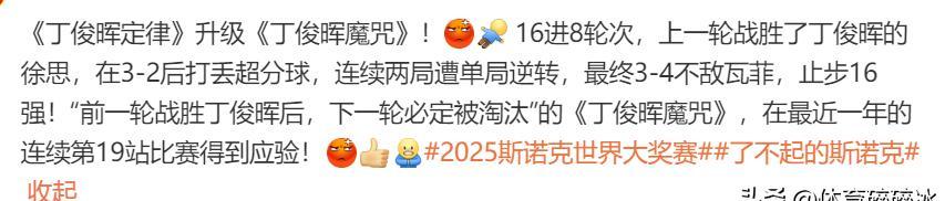 丁俊晖的魔咒在最近的比赛中引起了广泛的关注,许多球员在战胜他后接连出局,这种现象让人感到不可思议。人们开始讨论这是否是一种心理现象,还是丁俊晖本身的某种神秘力量在作祟。无论如何,这种魔咒似乎已经成为了一个不容忽视的话题。