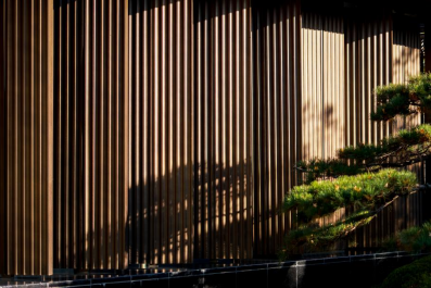 石廊两端采用密斯凡德罗德国馆的空间设计理念。流瀑石廊将光影流转投影,旋转金属屏风可以将不同时间的天光洒在后面的自然石面上,形成有规律的光影变化。同时廊顶的天光洒在地面和水台上,光影交错,让人在时光的流转中得到艺术和自然结合的美学感受,体现“每一个角落都被礼遇设计”的香山樾设计原则。