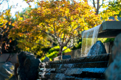 穿过大门,进入澄心庭院,奔涌的泉水如珠玉轻淌,心情也静下来,聆听愉悦的林泉回响。