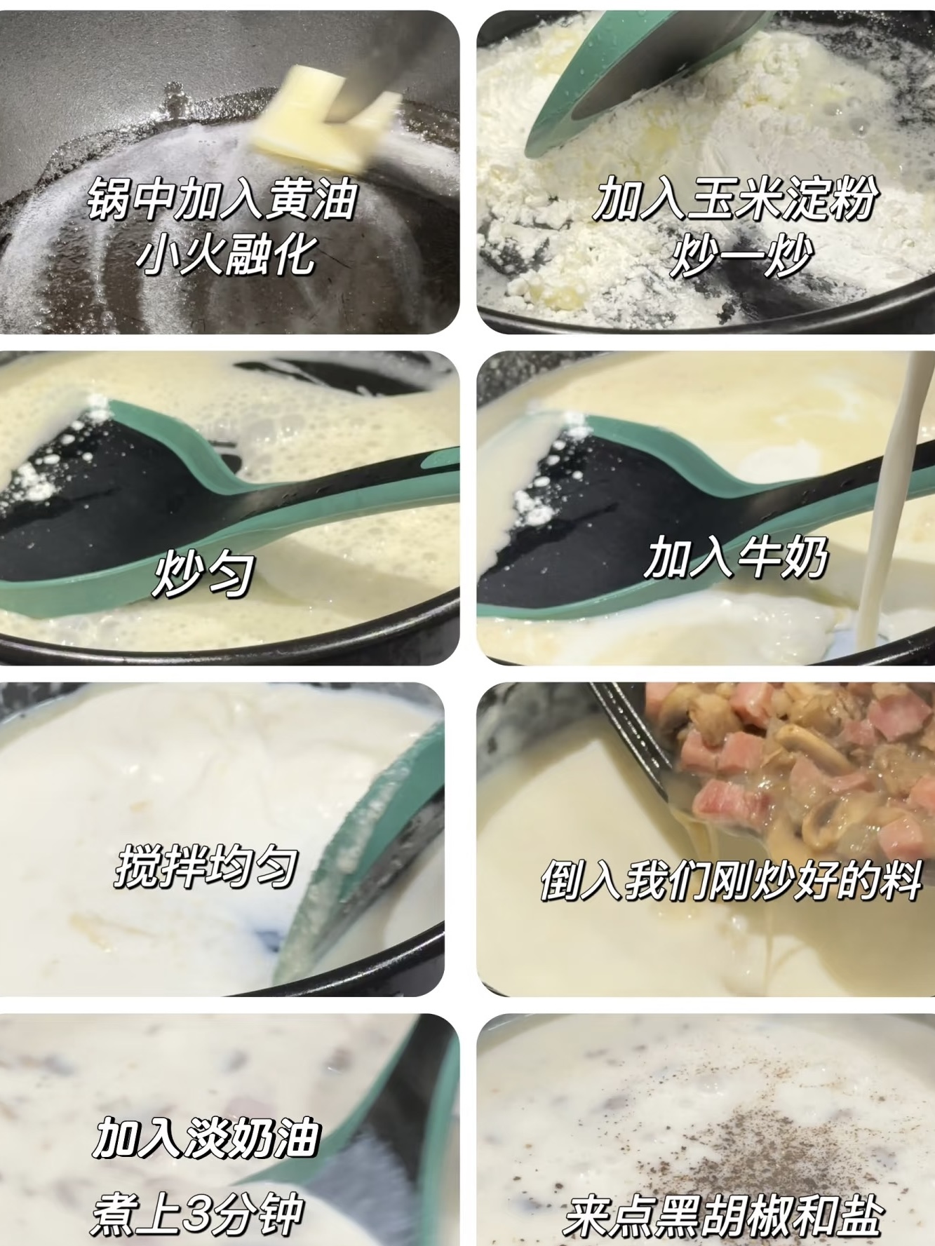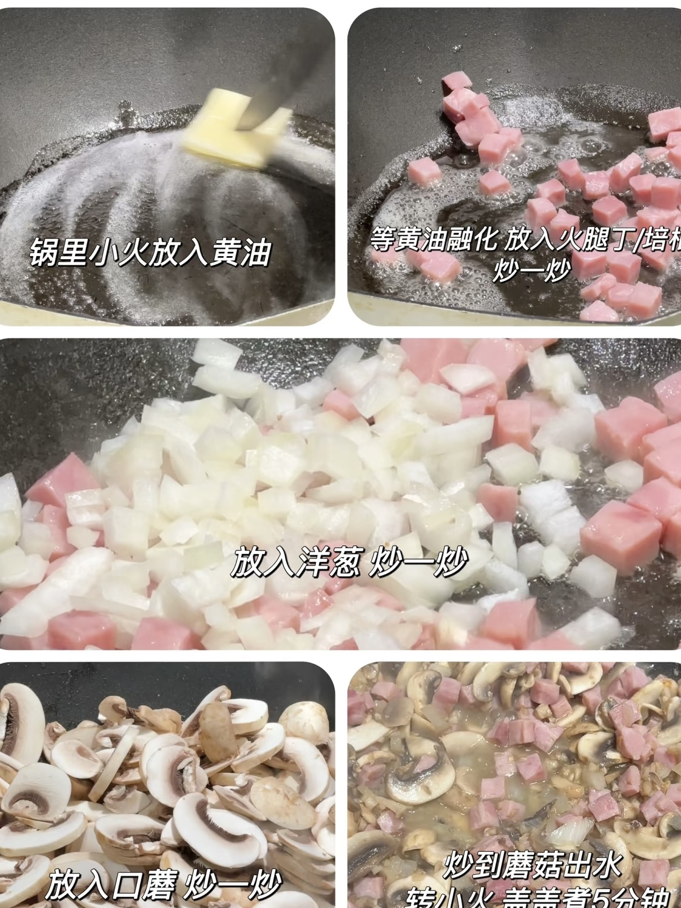 仪式感从热锅开始。小火!小火!小火!重要的事喊三遍。黄油丢进去,像太阳下的冰淇淋慢慢塌成金池,这时候把火腿丁撒进去,“滋啦”一声,香味像小精灵往鼻子里钻。接着洋葱登场,炒到透明带微焦边,颜色像琥珀,蘑菇再下锅,耐心炒到它“出汗”——伞盖缩小、锅底出现浅浅一层蘑菇汁,才算合格。