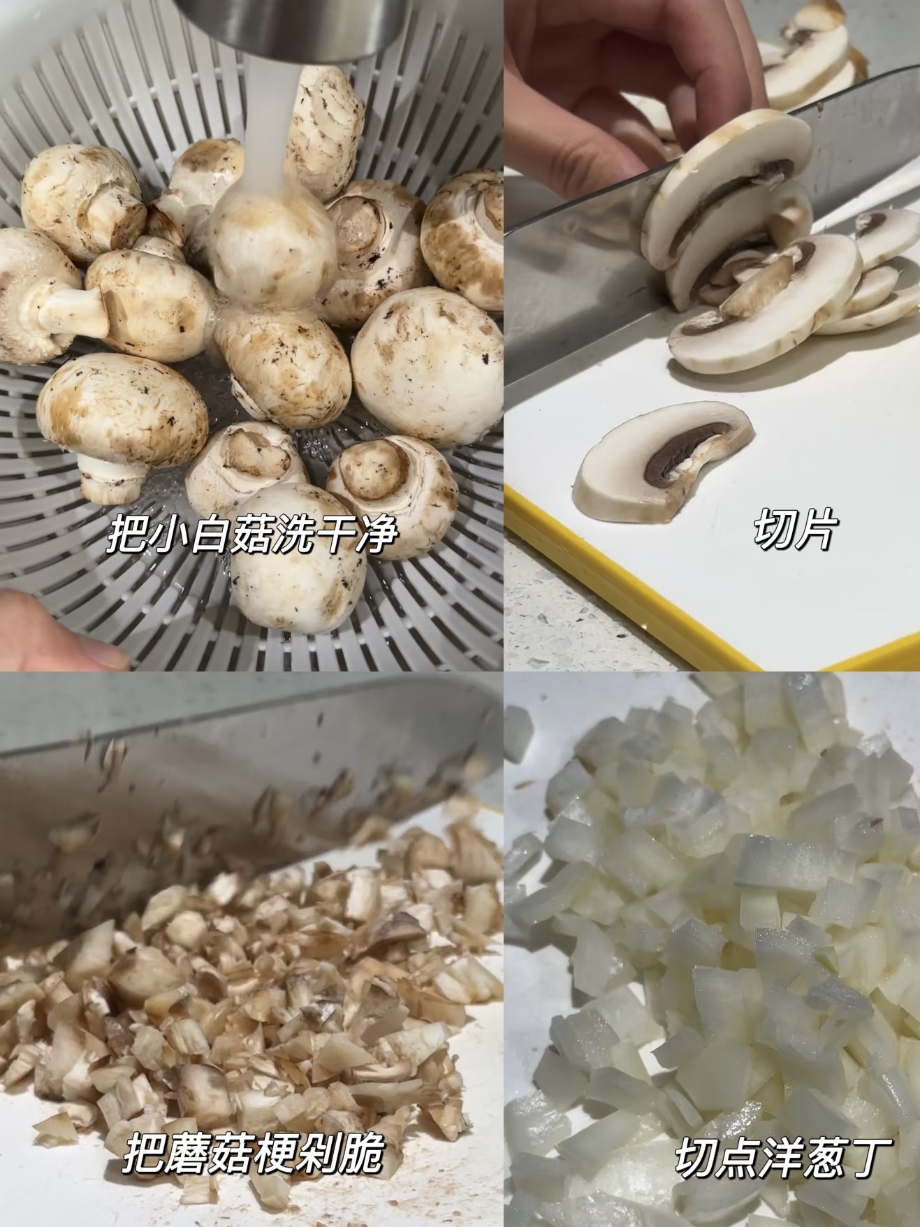 先说蘑菇。口蘑(白蘑菇)是灵魂,胖嘟嘟的伞盖像mini雨伞,味道淡却不抢戏,切开后横截面还会微微泛红,颜值在线。记得别用水狂冲,它像海绵,一吸水就失去“蘑菇香”,轻轻拿湿厨房纸擦擦表面就行。擦完把梗掰下来,别丢,剁得碎碎的和伞盖一起下锅,省钱又增香。