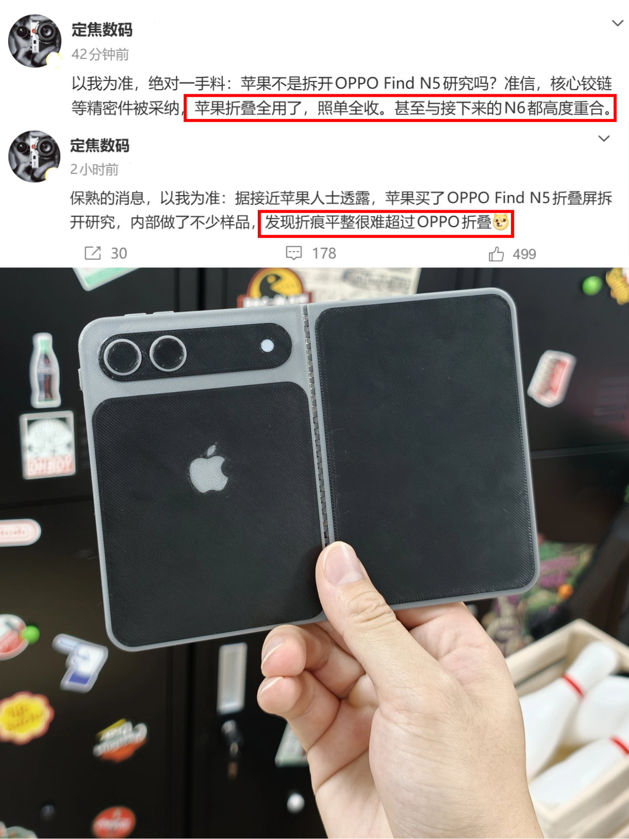 之前其实就有传出,苹果为了做折叠屏,专门买了OPPO Find N5回去拆机研究,现在新爆料来了,苹果不止研究,还要直接照搬,接下来的iPhone Fold用的铰链、中框、边框等关键部件估计会跟新款OPPO Find N6高度重合,本以为苹果是偷师OPPO,没想到更是照葫芦画瓢?