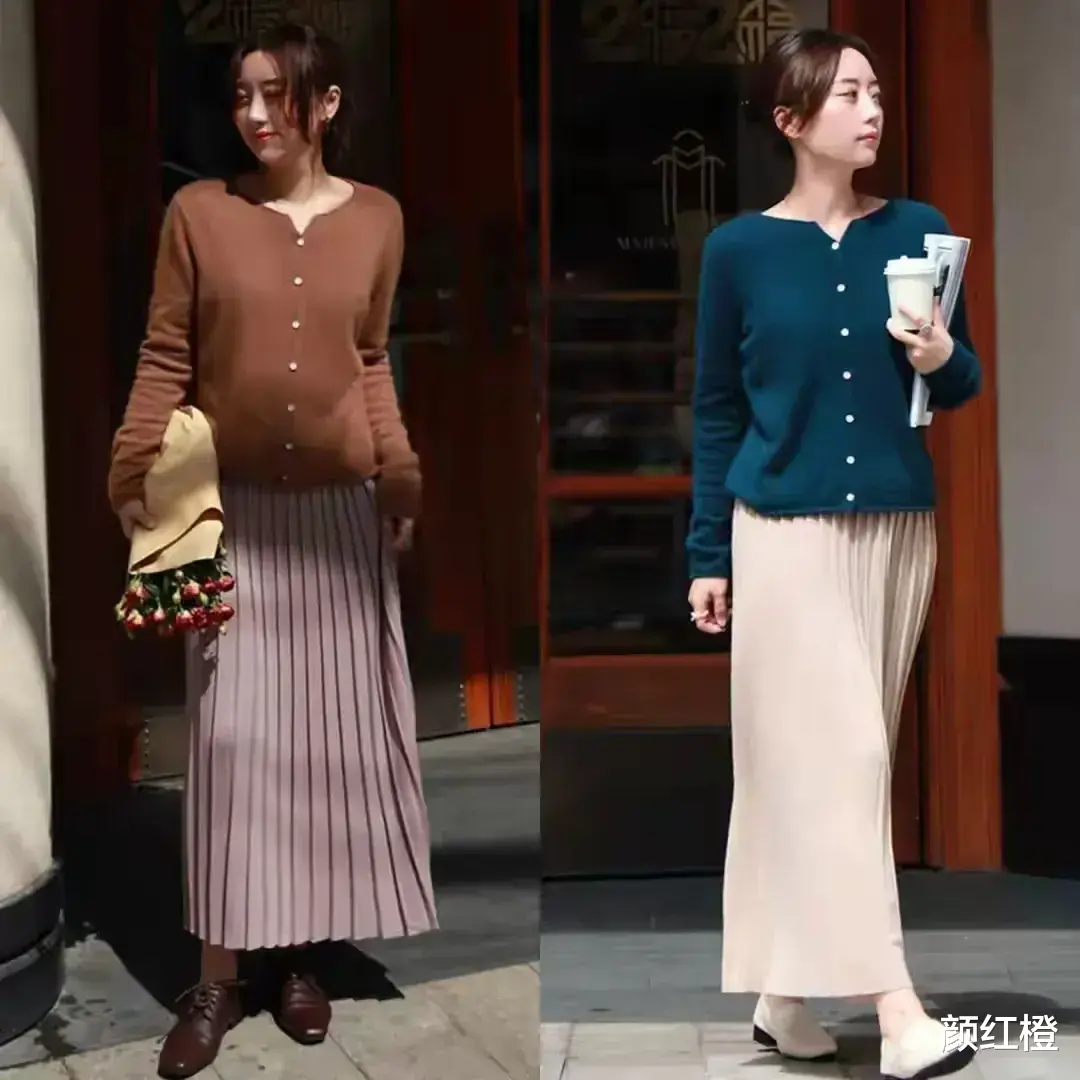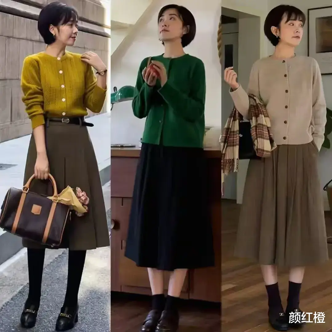 这个秋季我们可以选择薄款的针织开衫,透气性好一点的款式搭配上a字半身裙或者是散装半身裙都非常的大气,例如下面这位博主就选择不同颜色的针织开衫和半身裙进行组合,搭配脚上踩着一双黑色的乐福鞋就够了,轻轻松松穿出高级感。
