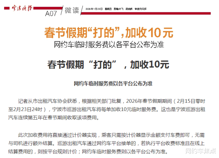 最近,宁波就出通知2026年春节期间,出租汽车将每单加收10元临时服务费。