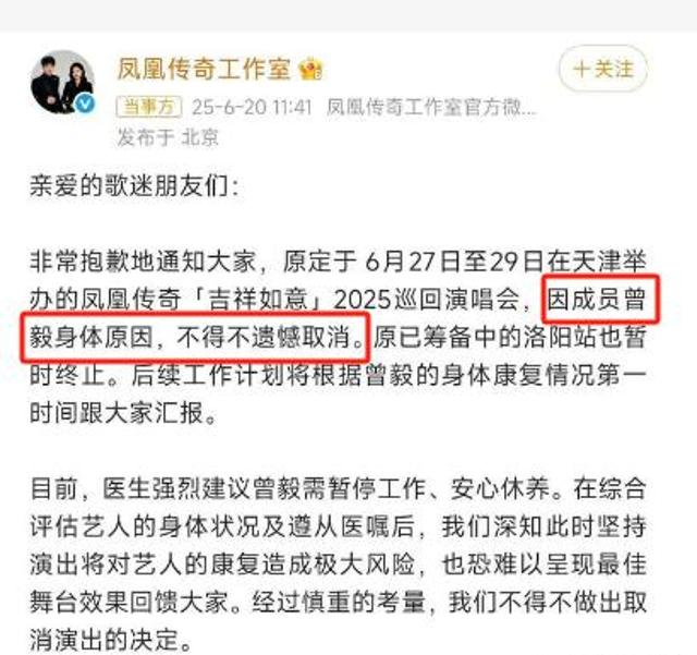 6月20日,凤凰传奇工作室突然宣布,原定于6月27日至29日在天津举办的演唱会,因为曾毅身体原因取消了,就连正在筹备中的洛阳站也暂时终止了。