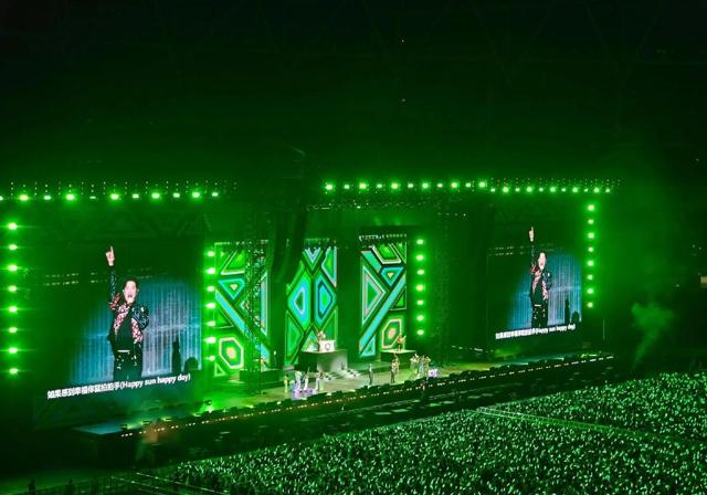 现场观众横跨60后到00后,全场一起挥舞着荧光棒,动作非常整齐,还被网友戏称为“全民军训式演唱”。