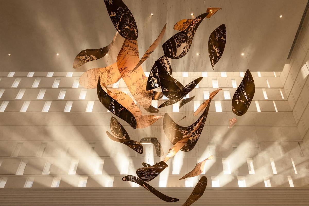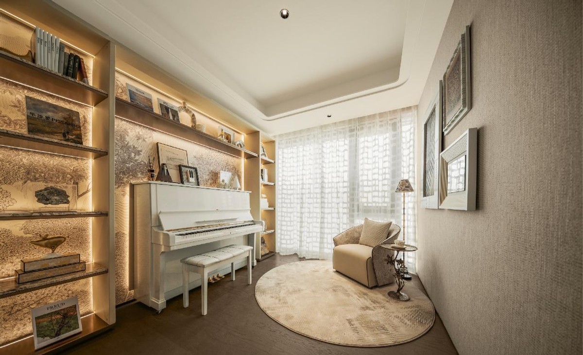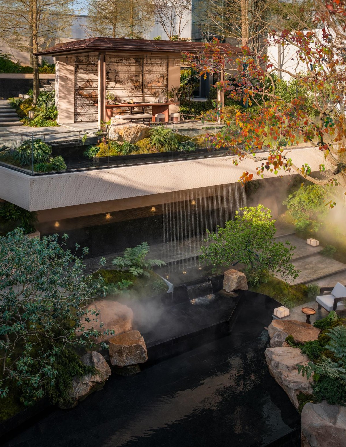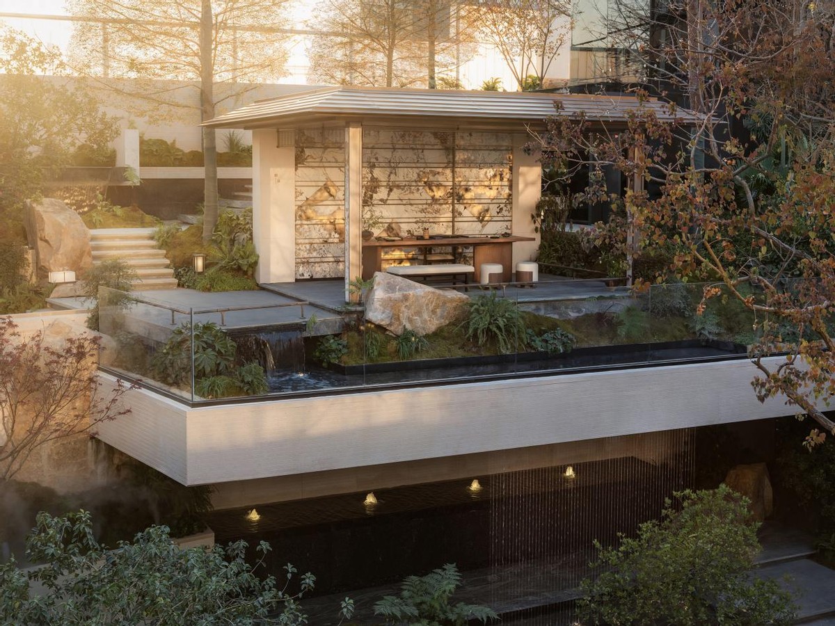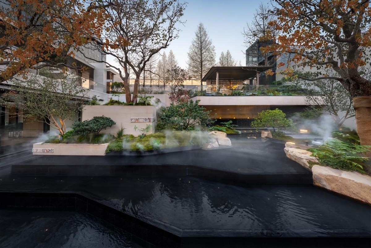 沿庭院漫步,瀑布落溪、溪转成涧、涧聚成池的自然景观,让“山水”不再是远观的画卷,而是可步入的秘境。下沉庭院与乐器的“自然之音”相得益彰,宛如天地间的自然音乐厅。静坐,听流水如琴音婉转,城市的喧嚣顿时消散无踪。