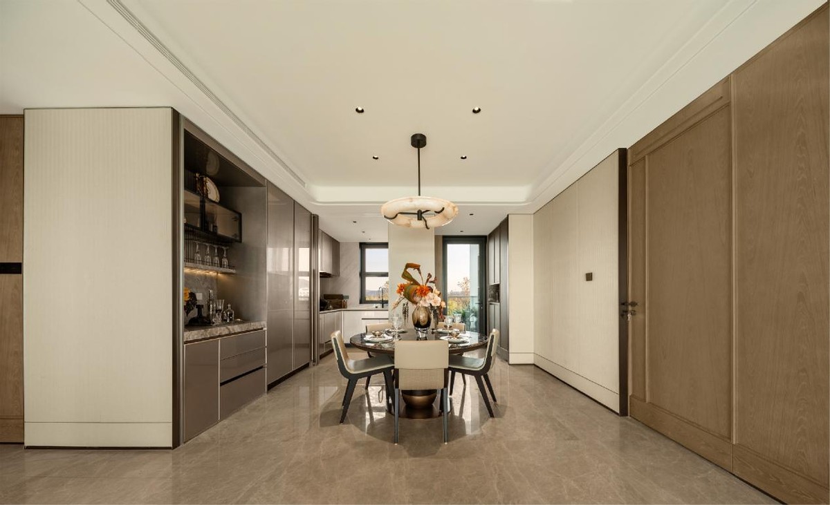 衔接下沉庭院的「跃清波」亲子恒温泳池,内外无界相融,勾勒出一处洋溢着度假氛围与社交气息的悠闲空间。移步至「云飨」私宴厅,室内器皿精致高雅,室外环幕视野将园林盛景框成如画之景,于杯盏交错间,尽情品味“大隐于市”的私宴极致韵味。