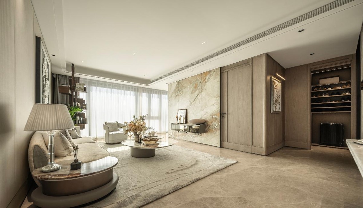 步入【天光序】归家大堂,格栅式石材墙体犹如一面归家屏风,界定空间仪式序列。以传统“漏景与借景”方式,引天光入境,于若隐若现中,空间层次悄然铺展,令归家心境从容过渡,沉浸于东方美学的静谧氛围。