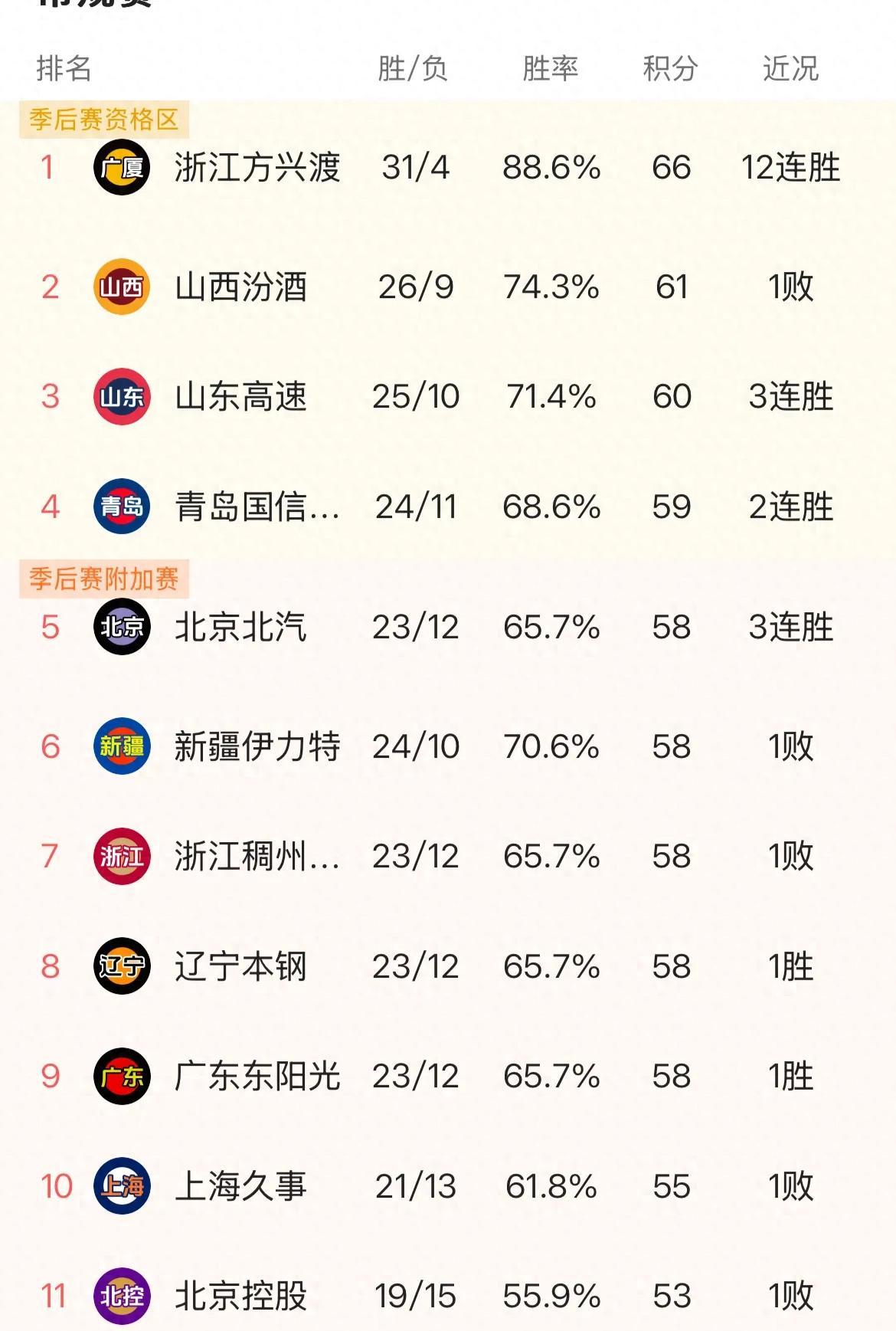 辽宁和广东这两支老牌劲旅现在都是23胜12负,看起来挺不错的,但其实离前四名就差那么一个胜场,这可不是小事啊。要知道前四名的基础胜率都高达68.6%,想要追上去可不容易。算了算,至少得把胜率提高到77%才行,这意味着接下来的11场比赛至少得赢8场,压力山大啊。所以今晚这场辽粤大战,谁输了基本就可以跟前四说再见了,真是输不起啊。