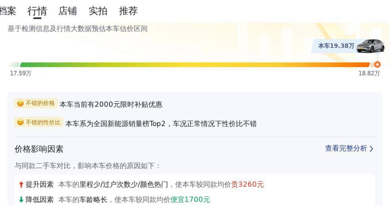 然而,二手车的价格并非一成不变,它受到多种因素的影响。我们通过查询二手车交易平台的数据发现,同款车型,类似车况的Model Y,报价在16.87万到19.86万之间浮动。19.38万的报价处于中等水平,并没有明显的优势。因此,在价格谈判方面,还有进一步的空间。
