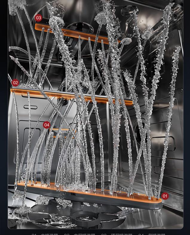 【洗涤技术】采用四层四翼洗+高能气泡洗,3个喷淋臂+背部两排翼状喷水口,搭配高能气泡洗,50000pa高压水流,轻松洗净中式重油顽渍以及锅底等“死角”区域。还有下层速洗功能。