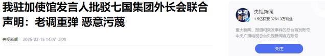 央视新闻2025-03-15——我驻加使馆发言人批驳七国集团外长会联合声明:老调重弹 恶意污蔑