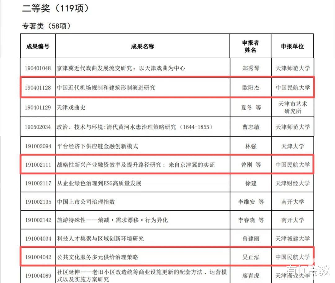 不久前天津市第十九届社会科学优秀成果奖的评选结果,为中航大的科研育人理念写下了有力注脚。该校3项成果斩获专著类二等奖,创下历史最佳成绩。交通科学与工程学院欧阳杰教授的《中国近代机场规制和建筑形制演进研究》,填补了民航历史建筑研究的空白;经济与管理学院曾刚副教授团队的《战略性新兴产业融资效率及提升路径研究:来自京津冀的实证》,为区域民航产业发展提供了经济解决方案;吴正泓副教授的《公共文化服务多元供给治理策略》,则将民航服务与公共文化建设相融合。这三项成果的共性,在于它们都实现了“科研价值”与“育人价值”的同频共振。