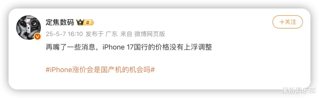 据科技博主 @定焦数码爆料,iPhone 17 系列的国行售价将不会迎来上浮调整。