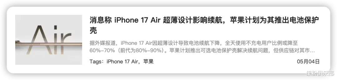 基于此,苹果可能会为 iPhone 17 Air 推出专属电池保护壳,以保证其续航性能。