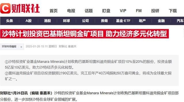 新浪财经《斥资10亿美元!PIF支持的投资基金竞购巴基斯坦Reko Diq矿业项目15%股权》