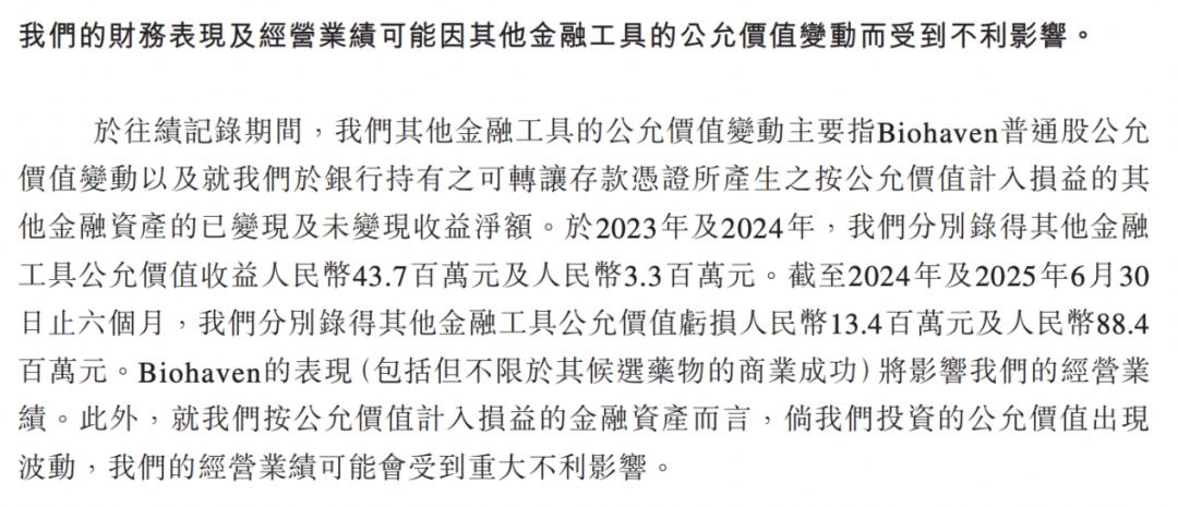 2024年及2025年上半年,Biohaven的股价下行分别对其他金融工具的公允价值变动造成了1340万元和8840万元的亏损。