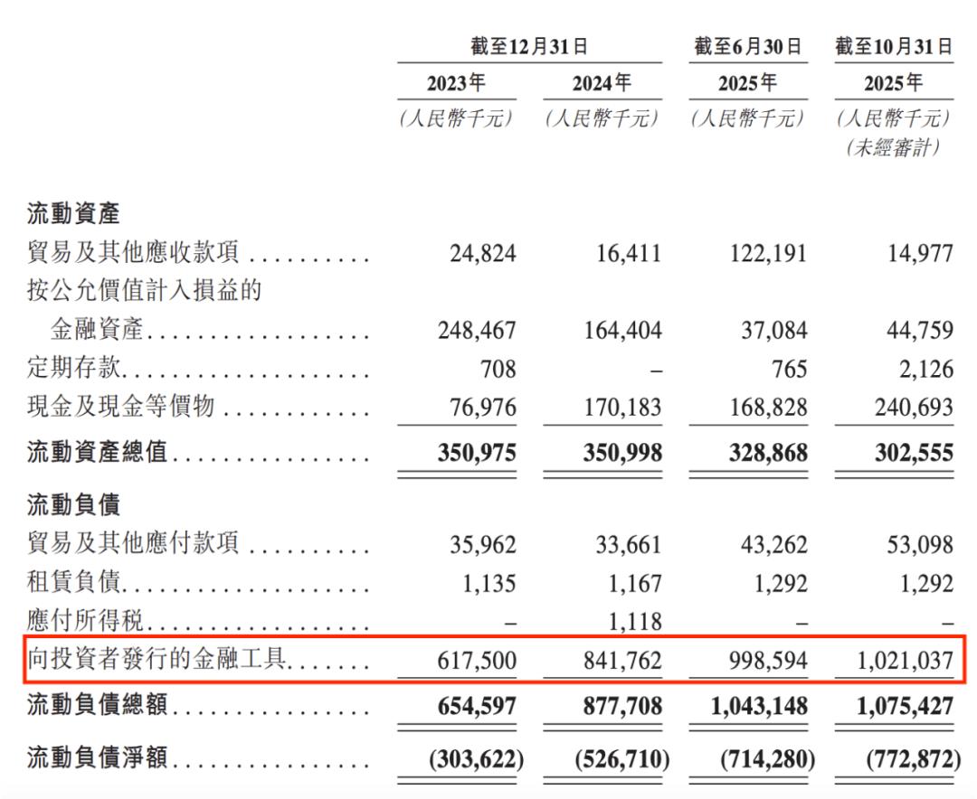 从2023年到2025年上半年,高光制药的流动负债总额分别为6.55亿元、8.78亿元和10.43亿元,其中“向投资者发行的金融工具”始终占据主要部分。截至2025年10月31日,这项负债升至10.21亿元,占同期流动负债的比例约95%,显示出高光制药紧迫的上市压力。