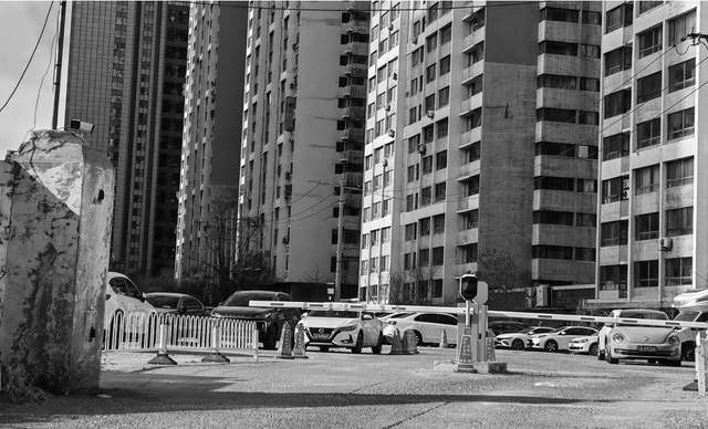 “内部停车,外车莫入”,大门口蓝底白字的牌子非常显眼,让人真的以为这是某单位的内部停车场。往里走三四米的位置立了双向道闸杆,供车辆出入。北面的停车位距离居民楼的距离大约有二三十米远。
