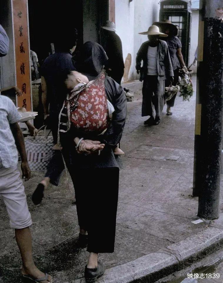在一条古老的街道上,一位老奶奶背着她的孙子。从她的头巾,以及背小孩的样子来看,她们可能是客家人。