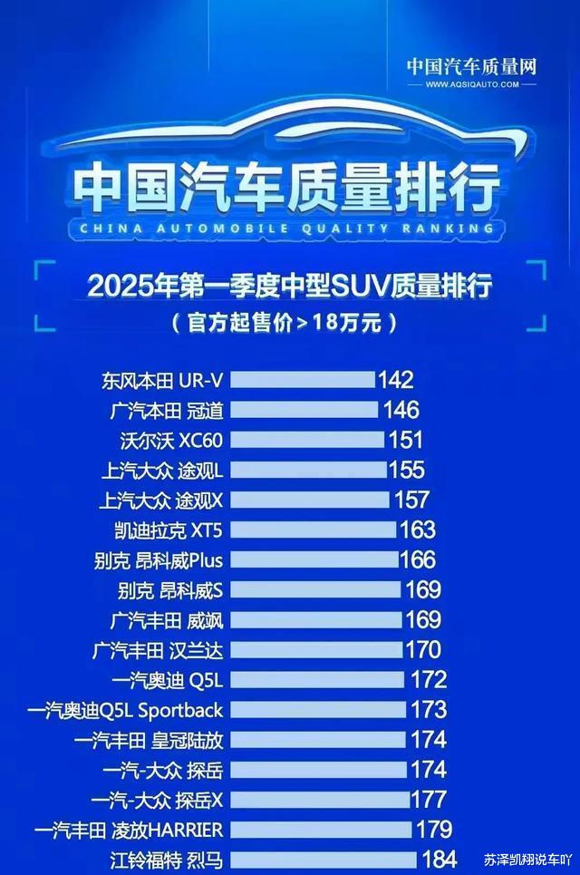 先上硬货,2025年第一季度中型SUV质量排行,是中国汽车质量网发布的,针对的是官方起售价大于18万元的燃油中型SUV,总共29款车上榜。