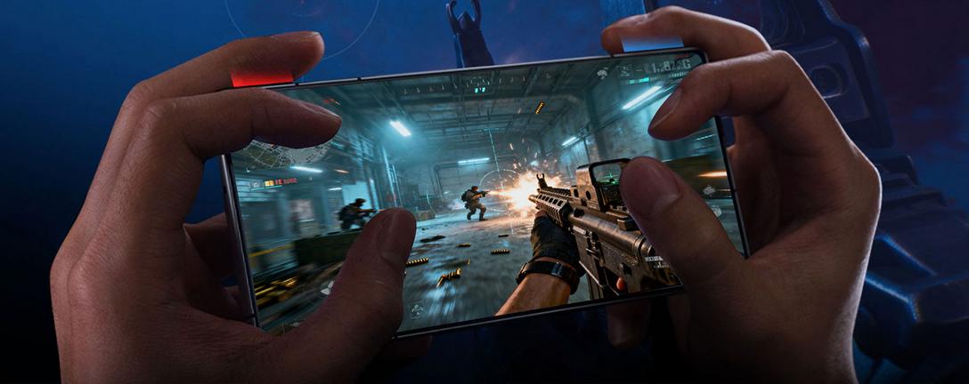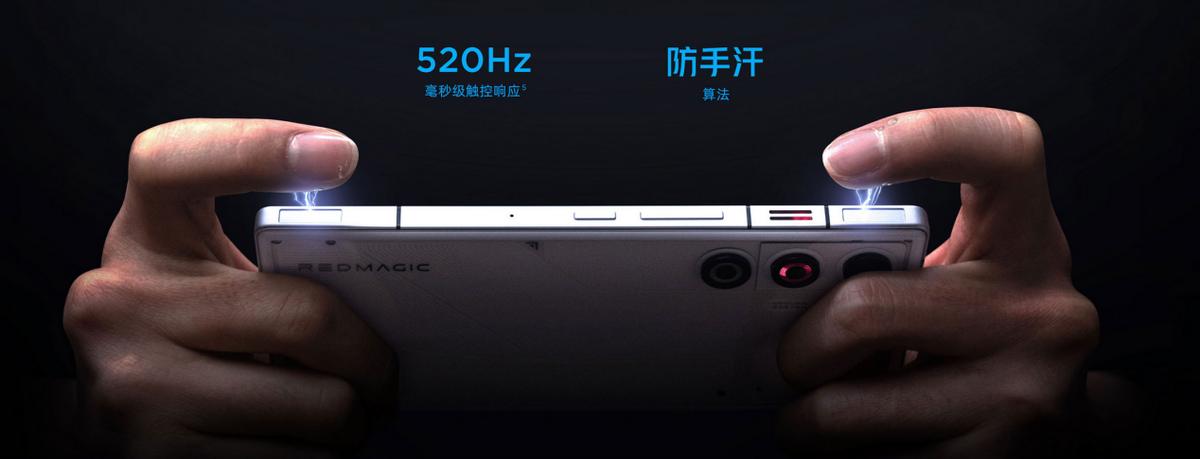 它的散热也很有特点!常规的是加厚设计的冰阶VC散热片,比普通VC散热更强,这是被动散热;而它还有主动散热--它通过航空铝风冷支架搭配首次加入的主动散热风扇搭配,让手机的散热能力进一步提升,应对高温室外场景会有明显效果。它的机身右侧还安排了很特别的、不凸起的双肩键设计,触控式的设计是它能够保持机身一体性的前提,而且这个肩键最高支持520Hz的毫秒级触控响应,这就了不得了!这也意味着你使用它玩手游的时候有了一个“不累赘”的 物理外挂,对FPS游戏尤其作用明显有木有?