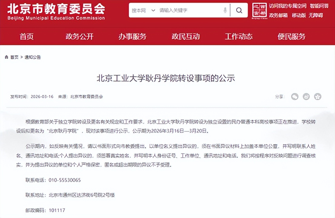 近日,北京市教委发布公告称,北京工业大学耿丹学院转设为独立设置的民办普通本科高校 “北京耿丹学院”。