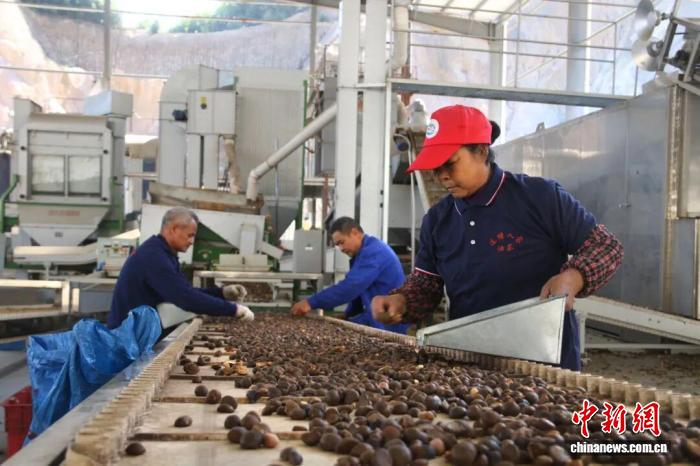 霜降过后,广东省各地陆续进入油茶果采摘高峰期。走进位于清远英德连江口镇的油茶种植基地,工人们正将采摘好的茶果打包装,运输到位于连樟村的茶油加工厂里。新鲜的油茶果经过烘干、脱壳、筛选等工序,制成一颗颗棕黑色的油茶籽。最终通过物理压榨,加工成飘香四溢的美味茶油,实现“粒粒黄金果,滴滴黄金油”。