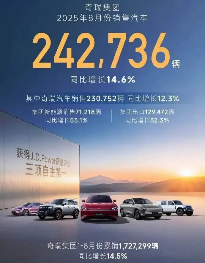 根据奇瑞集团公布的数据,其8月销量为24.27万辆,同比增长14.6%。1-8月累计销量为172.72万辆,同比增长14.5%,去年同期为150.82万辆。