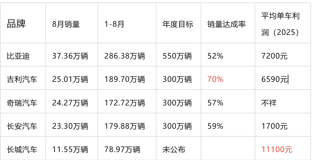 从比亚迪、吉利、奇瑞、长安、长城这“中国五大”车企1-8月的销量和经营情况不难看出, 2025年,吉利汽车或是中国唯一一个能超额完成销量目标,且目标销量在百万辆以上的中国车企。其全年销量或达320万辆,高于其300万辆的销量目标。从这一点来看,可以用一骑绝尘的“绝”字来形容2025年的吉利。