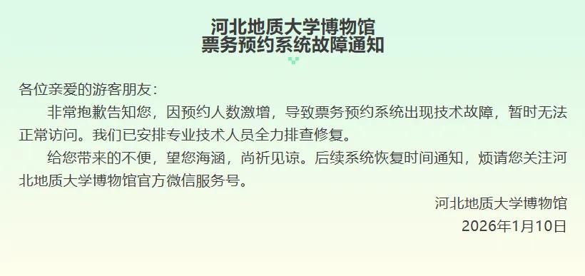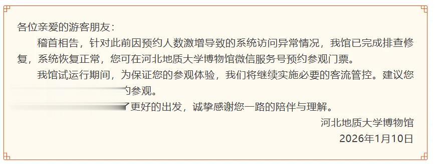 在历经10天紧锣密鼓试运营的“热身”之后,河北地质大学博物馆新馆终于在昨天(1月13日)正式投入运营了!这座随着大学搬迁至滹沱河畔的“知识殿堂”,自试运营起就牵动着无数网友、家长和孩子的好奇心,大家都想“一睹真容”,亲身感受恐龙化石和地球演化的奥秘。然而,试运营的火爆人气也带来了始料未及的“甜蜜烦恼”。上周,不少满怀期待的参观者纷纷吐槽,主要集中在两点:“预约难,难于上青天” 与 “服务态度有点冷冰冰”。