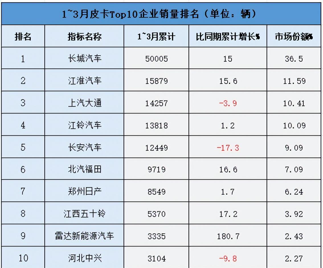 新一季度的销售数据显示,整个1季度皮卡市场累计销售达到了13.7万辆,同比增长6.8%,这表明市场的恢复情况持续向好。然而,具体分析后发现,只有7家大企业实现了正增长,其中雷达新能源汽车以180.7%的增幅领先。这显示出一个残酷的现实:在市场整体向情况下,仍有不少企业未能抓住机遇,从而形成了“强者愈强,弱者愈弱”的局面。这样的分化现象,不仅对行业未来的格局产生深远影响,也将关系到消费者的选择。