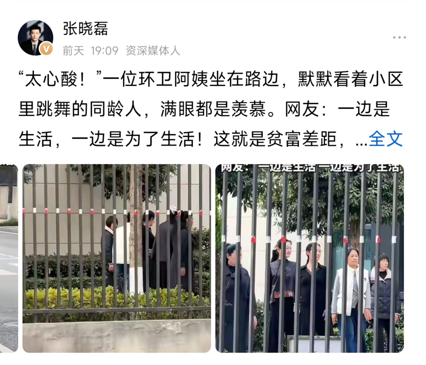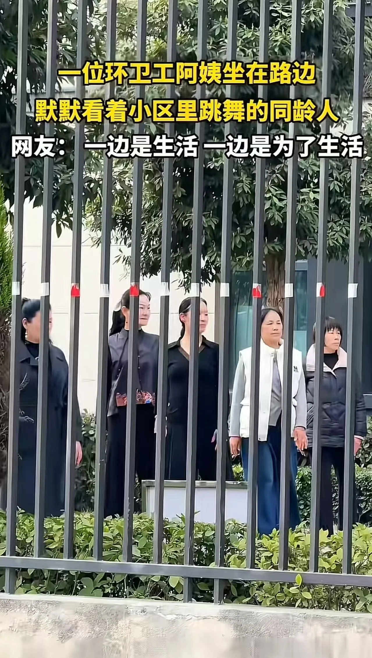 小区里的阿姨们穿着得体的衣服,跟着音乐舒展身体,脸上是放松和惬意;而环卫工阿姨裹着厚外套,身边放着扫帚和簸箕,眼神里有羡慕,也有一丝说不出的落寞。网友说“一边是生活,一边是为了生活”,这句话太戳心了。