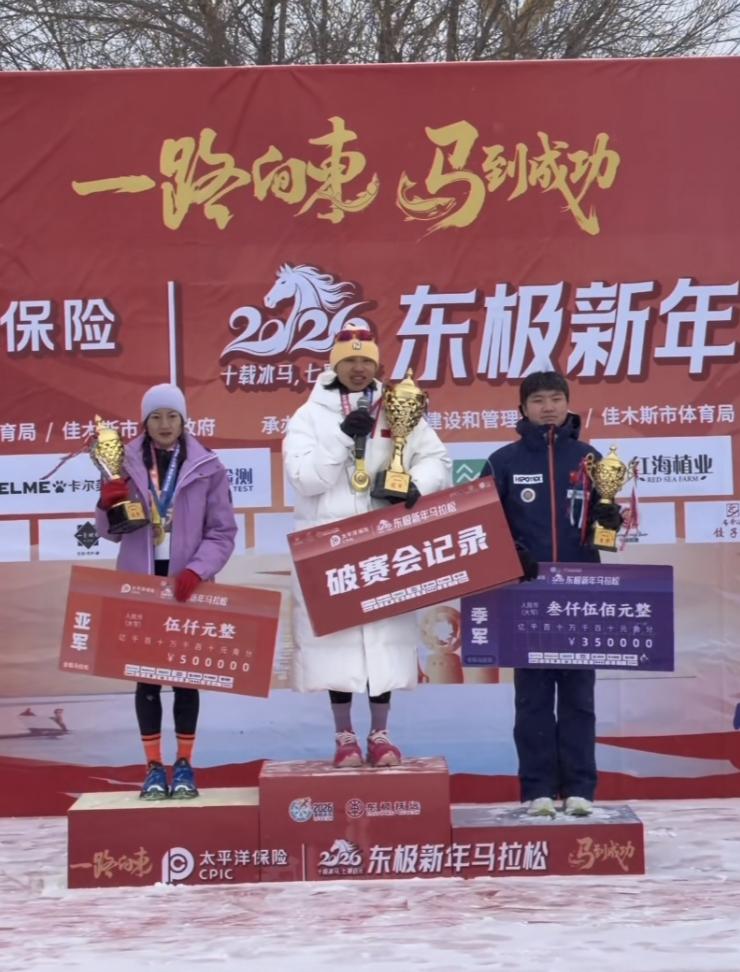 张水华(中)在抚远东极新年马拉松中获得女子全程组第一名。