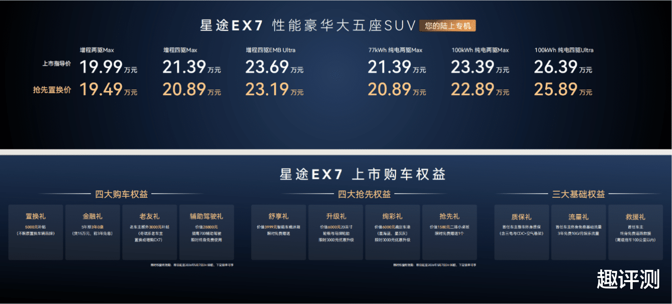 星途EX7提供纯电与增程双动力选择,共推出增程两驱Max、增程四驱Max、增程四驱EMB Ultra以及77kWh 纯电两驱Max、100kWh 纯电两驱Max、100kWh 纯电四驱Ultra六款车型,官方指导价为19.99万元—26.39万元,抢先置换价为19.49万元—25.89万元。与此同时,星途汽车官方还为用户提供了多重购车福利:包括置换礼、金融礼、老友礼、辅助驾驶礼四大购车权益;舒享礼、升级礼、绚彩礼、抢先礼四大抢先礼;此外,首任车主还可享受整车终身质保、终身免费基础流量、终身免费救援礼三大基础权益,让每位用户轻松拥有豪华奢享出行新体验。